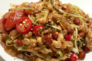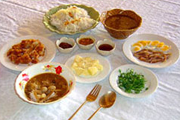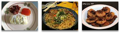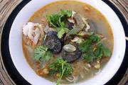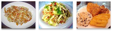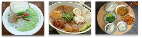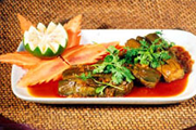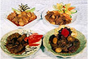 But beef is usually not served. Vegetables are cut and cooked in various ways, usually with a small amount of oil and dried prawn to enhance the taste. Salads are mostly made of raw, cooked or preserved vegetables, or sometimes meat, fish or prawn, added with a number of ingredients to enrich the flavour. There are four main types of soups: sweet broth, hot and spicy, sour, and bean soup.